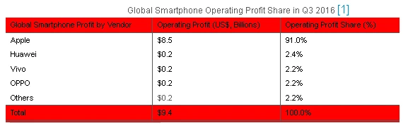 Strategy Analytics nimmt in einer aktuellen Studie die operativen Smartphone-Gewinne der großen Hersteller aus dem dritten Quartal 2016 unter die Lupe. Der iPhone-Produzent Apple stellt die Konkurrenz einmal mehr in den Schatten.