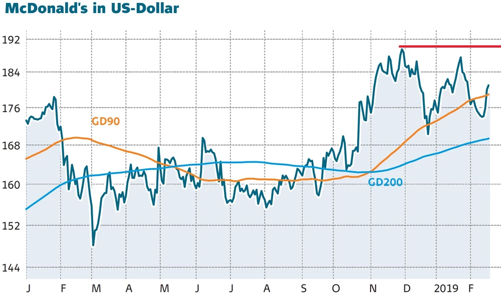 Fundamental ginge das Break auf ein neues Rekordhoch absolut in Ordnung. Mit einem 2019er-KGV von 22 und einer Dividendenrendite von 2,6 Prozent ist die Aktie im Peergroup-Vergleich günstig bewertet. Zudem: McDonald’s wächst immer noch. Nicht üppig, aber auch nicht weniger als die großen Konkurrenten Yum Brands und Restaurant Brand International (Burger King).