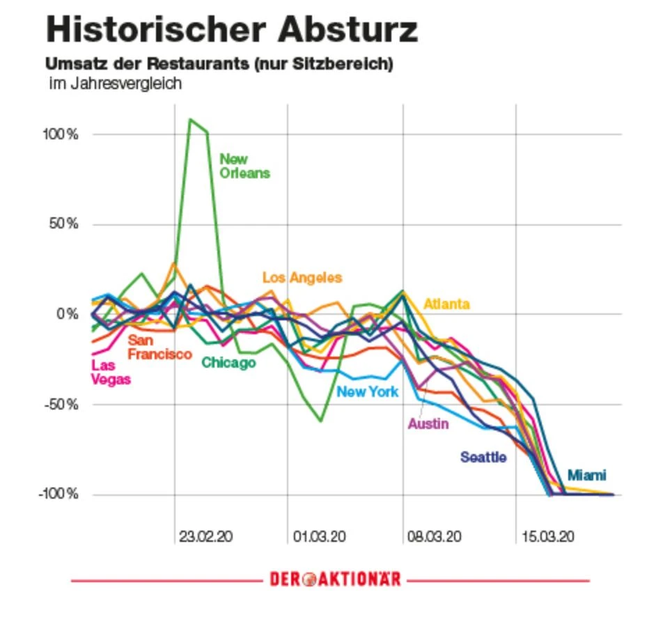 McDonald’s verbuchte im März einen Rückgang bei den weltweiten Umsätzen auf vergleichbarer Fläche von 22 Prozent. In den USA gingen die Verkäufe auf vergleichbarer Fläche um 13 Prozent zurück. Der Rückgang im Heimatmarkt fällt deswegen nicht so stark aus, weil viele Amerikaner generell lieber am Drive-in-Schalter bestellen und ihr Essen mitnehmen, als sich in eine Filiale zu setzen.