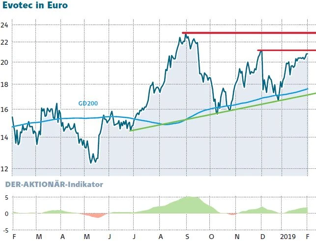 Die Aktie von Evotec scheint die kurze Verschnaufpause nach der Rallye zu Jahresbeginn bereits wieder abgeschlossen zu haben. Gut 1,3 Prozent gewinnt das Papier am Freitagvormittag auf 20,73 Euro. Damit nimmt die Aktie Kurs auf den nächsten wichtigen Widerstand in Form des Dezember-Zwischenhochs bei 21,82 Euro. Ein Sprung darüber würde ein neues Kaufsignal bedeuten. Auch das Allzeithoch bei 23,36 Euro, das im September vergangenen Jahres markiert wurde, wäre dann nicht mehr weit entfernt.