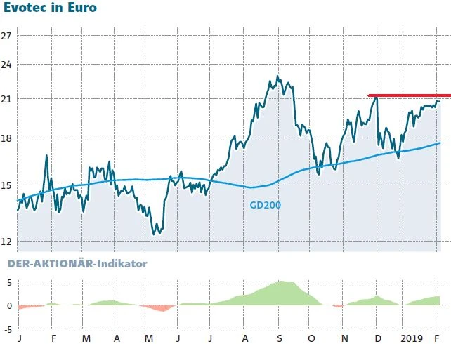 Nahezu unverändert präsentiert sich am heutigen Dienstag ein weiterer MDAX-Biotech-Wert: Evotec. Bis zur Bekanntgabe der Jahresergebnisse 2018 müssen sich Anleger hier zwar noch etwas gedulden – genauer gesagt bis zum 28. März 2019 -, dafür könnte ein charttechnisches Kaufsignal unmittelbar bevorstehen. Die Aktie notiert knapp unter dem Dezemberhoch 2018 bei 21,82 Euro. Ein Sprung darüber würde den Weg frei machen in Richtung Mehrjahreshoch, das im September vergangenen Jahres bei 23,36 Euro markiert wurde. Evotec bleibt ganz klar weiter einer der Favoriten des AKTIONÄR. Anleger sollten deswegen die Gewinne laufen lassen. Etwaige Rücksetzer sind hier langfristige Kaufchancen.
