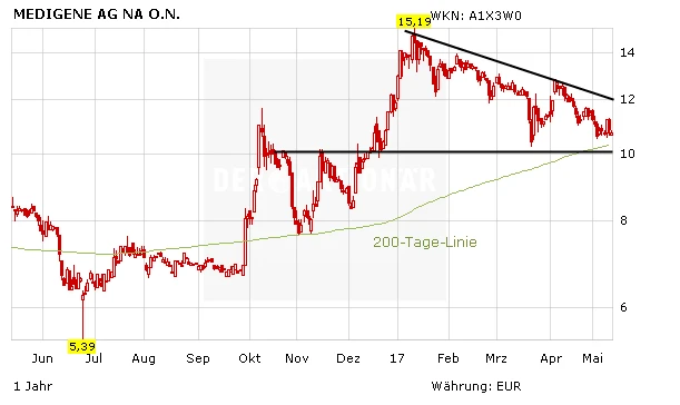 Die Analysten von Independent Research kommentieren den Quartalsbericht von Medigene: „Das Zahlenwerk für das erste Quartal 2017 blieb insgesamt ohne größere Überraschungen. Umsatzseitig profitierte Medigene von der bluebird bio-Partnerschaft, während ergebnisseitig erwartungsgemäß höhere F&E-Ausgaben belasteten. Der Ausblick für 2017 wurde bestätigt. Die strategische Partnerschaft mit bluebird bio zeigt unseres Erachtens das große Potenzial und bietet zudem signifikante finanzielle Ressourcen. Anfang Mai hatte Medigene darüber hinaus im Rahmen einer Kapitalerhöhung problemlos 21 Millionen Euro erlöst. Dies bietet dem Unternehmen zusätzliche Flexibilität bei der Entwicklung der einen Immuntherapien.“ Independent Research sieht ein Potenzial für die Aktie bis auf 12 Euro. DER AKTIONÄR beurteilt die Entwicklungen bei Medigene allerdings deutlich positiver. Selbst eine Verdopplung in den kommenden Monaten ist möglich. Kurzfristig ist wichtig, dass die 200-Tage-Linie verteidigt werden kann. Allerdings eignet sich der Wert weiterhin nur für risikobereite Anleger.