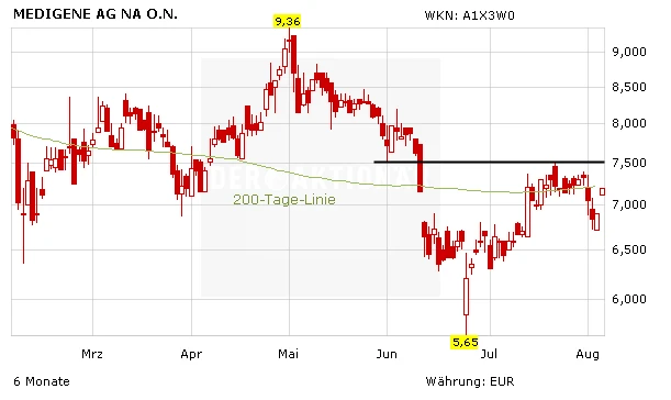 Die Aktie von Medigene gewinnt am Vormittag knapp ein Prozent auf 7,19 Euro. Damit befindet sich der Wert nurmehr knapp unter der 200-Tage-Linie. Ein nachhaltiger Sprung darüber sowie über den horizontalen Widerstand bei 7,50 Euro würde ein klares Kaufsignal bedeuten.