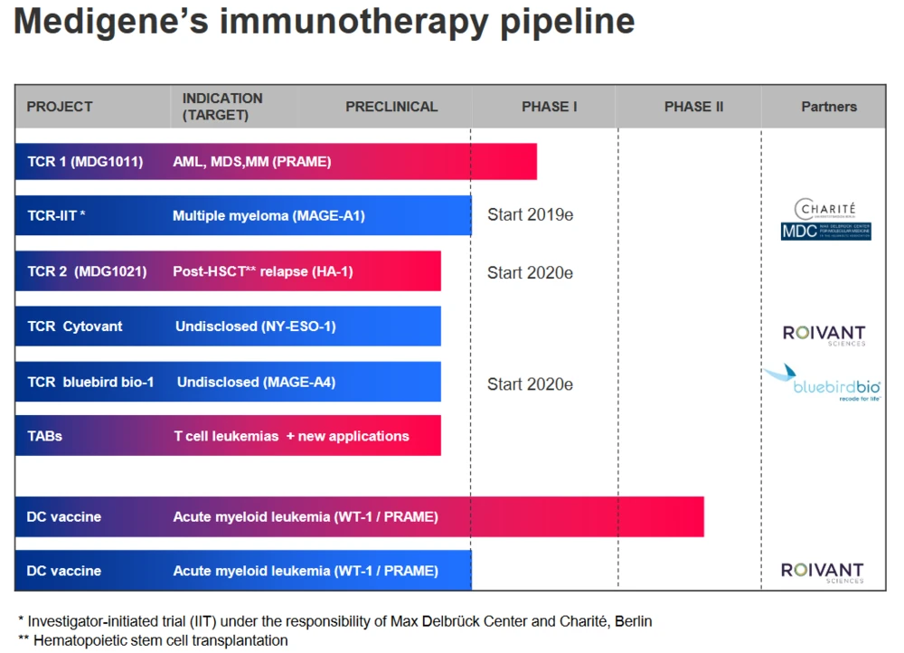 Bereits Anfang Mai gab es positive News zur Partnerschaft mit Bluebird Bio. Bluebird hat vielversprechende präklinische Daten zum ersten therapeutischen T-Zellrezeptor (TCR)-Kandidaten aus der Forschungs- und Entwicklungspartnerschaft mit Medigene präsentiert. Zudem gab das US-Unternehmen Pläne für den Beginn der klinischen Entwicklung mit diesem TCR Kandidaten im Jahr 2020 bekannt. Der TCR-Kandidat richtet sich gegen das Tumorantigen MAGE-A4, welches auf einer Vielzahl von soliden Tumorarten exprimiert wird, hieß es in einer Mitteilung von Medigene.