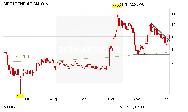 An der Börse wird der Wiederaufstieg ordentlich gefeiert. Die Aktie von Medigene gewinnt am Dienstagnachmittag knapp sieben Prozent auf 9,13 Euro. Damit kann der Wert auch den kurzfristigen Abwärtstrend nach oben durchbrechen. Der nächste wichtige Widerstand wartet in Form des Novemberhochs bei 10,21 Euro. Gelingt der Sprung darüber, wäre dies als weiteres Kaufsignal zu werten. Bei 11,63 Euro wartet das bisherige Jahreshoch, das im Oktober markiert wurde. DER AKTIONÄR empfiehlt die Aktie weiter zum Kauf.