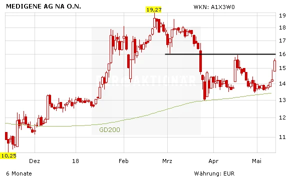 Mit dem heutigen Kurssprung ist die Aktie von Medigene wieder nahe an den charttechnischen Widerstand bei knapp 16 Euro herangelaufen. Ein Sprung darüber würde ein neues Kaufsignal bedeuten. Was Sie sonst noch alles über Medigene wissen müssen, ein hochinteressantes Exklusiv-Interview mit der Vorstandsvorsitzenden Dolores Schendel sowie einen neuen Geheimtipp lesen Sie im neuen großen Aktienreport „Medigene: große Sonderanalyse + neuer 100%-Geheimtipp“, den Sie hier herunterladen können.