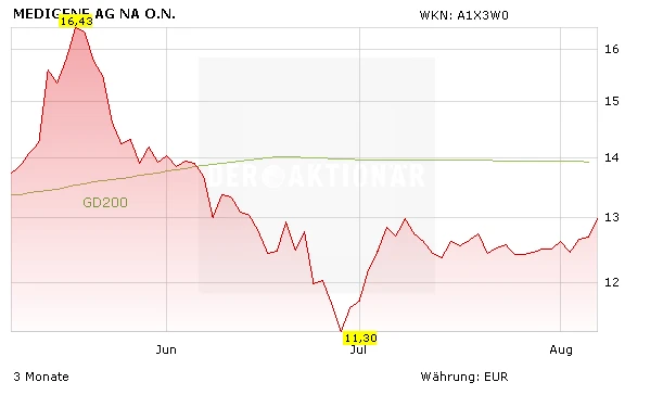 Während Morphosys und Evotec in diesem Jahr eine sehr starke Performance zeigen konnten, musste der ebenfalls im TecDAX notierte Biotechwert Medigene seit dem Jahreshoch im Februar bei 19,42 Euro ordentlich Federn lassen. Im Juni rutschte die Aktie zudem unter die 200-Tage-Linie. Am heutigen Dienstag hat das Unternehmen die Zahlen für das zweite Quartal vorgelegt. Am frühen Morgen profitiert die Aktie davon mit einem Plus von 2,2 Prozent. Dank geringerer Kosten hat Medigene seinen Verlust reduzieren können. Das Minus beim Ergebnis vor Zinsen, Steuern und Abschreibungen (Ebitda) verringerte sich um fast ein Fünftel auf rund 3,04 Millionen Euro, wie Medigene mitteilte. Unter dem Strich verringerte sich der Verlust um drei Prozent auf rund 3,7 Millionen Euro. Angeschoben durch starke Zuwächse aus der TCR-Partnerschaft mit dem US-Unternehmen Bluebird Bio konnte Medigene im zweiten Quartal die Erlöse um fast 20 Prozent auf 2,7 Millionen Euro steigern.