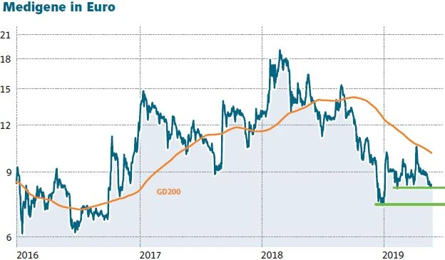 Die Aktie von Medigene reagiert zwar mit einem deutlichen Plus auf die jüngste Meldung, im längerfristigen Chart ist dies allerdings kauf zu erkennen. Für einen Befreiungsschlag müsste das Papier schon deutlich mehr zulegen. Eine wichtige Hürde stellt hier der Bereich um zehn Euro dar. Hier verläuft auch die 200-Tage-Linie. Derzeit ist es für die Aktie aber wichtiger, einige wichtige Unterstützungen zu verteidigen: das Februartief 2019 bei 8,10 Euro und das Dezember 2018 bei 7,20 Euro.