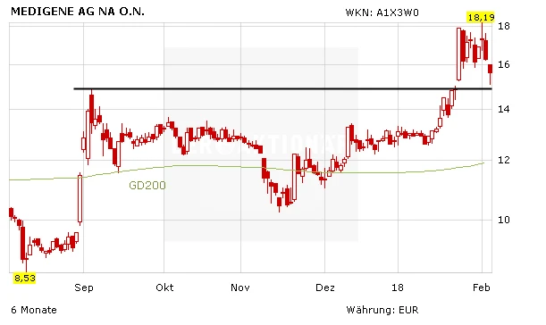 Die Aktie von Medigene war zuletzt nicht zu bremsen. Der Wert profitierte dabei von angelaufenen Übernahmekarussell in der Branche sowie der allgemein guten Verfassung der deutschen Biotech-Aktien. Bis auf 18,19 Euro konnte sich das Papier nach oben schrauben, bevor zuletzt eine Konsolidierung eingesetzt hat. Aus charttechnischer Sicht ist es nun wichtig, dass das Ausbruchsniveau bei 14,88 Euro erfolgreich verteidigt werden kann. Neue Kurstreiber könnten von der Kooperation mit Bluebird Bio kommen. Hier darf man darauf gespannt sein, wenn konkrete Ergebnisse der Kollaboration veröffentlicht werden.
