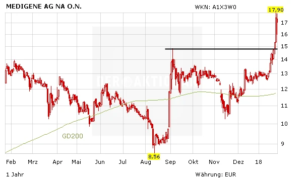 Beflügelt wurde die Aktie von Medigene zudem von einer Analysten-Einschätzung aus dem Hause Equits. „In der Krebs-Immuntherapie ist nach dem Kauf von Kite durch Gilead keine Ruhe eingekehrt, und die Preise steigen weiter", schrieb Analyst Thomas Schiessle. Im August 2017 hatte Gilead Sciences die Biotech-Firma Kite Pharma für knapp zwölf Milliarden Dollar geschluckt. Bei der Übernahme von Juno durch Celgene würden die Entwicklungsprojekte von Juno hoch bewertet, so der Experte. Für Medigene hat er deswegen seine Kaufempfehlung bestätigt und das Kursziel von 18,50 auf 21,30 Euro angehoben.