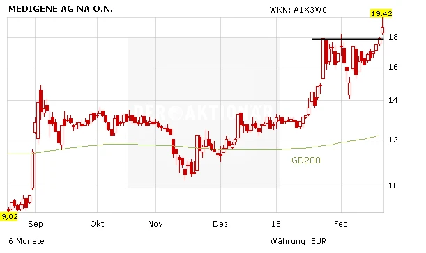Die Aktie von Medigene reagierte am heutigen Mittwoch mit einem deutlichen Kursplus auf die Meldung. Zuletzt gelang dem Wert der große charttechnische Ausbruch nach oben. Dieser dürfte weitere Anschlusskäufe nach sich ziehen. Allerdings ist mitterlweile auch bereits sehr viel im Kurs eingepreist, wenngleich die Aktie langfristig sicherlich weiter interessant ist. Weiter warten muss man auf detaillierte News auf der Bluebird-Kooperation, die mit Spannung erwartet werden. Anleger lassen ihre Gewinne laufen, ziehen aber zur Absicherung sukzessive den Stopp nach.