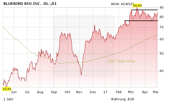 Im ersten Quartal 2017 stiegen die Erlöse auf 6,8 Millionen Dollar – erwartet wurden lediglich 2,1 Millionen Dollar. Unterm Strich erzielte Bluebird Bio einen Verlust von 1,68 Dollar pro Papier. Auch bei dieser Zahl konnte die Biotech-Firma die Defizit-Schätzung von 1,78 Dollar je Aktie übertreffen. Besonders erfreulich: Der Cashbestand von knapp 800 Millionen Dollar. Dieses Polster soll bis in die zweite Hälfte des Jahres 2019 ausreichen.