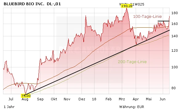Im vorbörslichen Handel gelingt der Bluebird-Bio-Aktie der Sprung über den horizontalen Widerstand im Bereich von 200 Dollar. Kann das Papier im heutigen Handel den Ausbruch bestätigen, dürfte die Aktie wieder in Richtung des Allzeithochs bei 236,17 Dollar vorstoßen. Bluebird Bio bleibt einer der heißesten Player im Bereich der Krebsimmun- und Gentherapie.