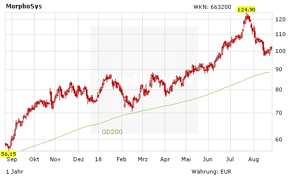 Doch hier gibt es keinen Grund zur Panik. Die Morphosys-Aktie hatte sich in den Monaten zuvor so stark entwickelt, dass eine Korrektur überfällig war. Noch immer ist der Wert mit plus 75 Prozent der fünftbeste Wert im Index im Jahresvergleich. Und auch fundamental stimmt bei Morphosys weiter alles. Die jüngsten Meldungen waren überzeugend. Zudem befindet sich die Zulassung des am weitesten fortgeschrittenen eigenen Projekts MOR208 in Reichweite. Im kommenden Jahr dürfte hier der Zulassungsantrag gestellt werden. Noch nicht investierte Anleger können die derzeitige Korrekturphase zum Einstieg nutzen.
