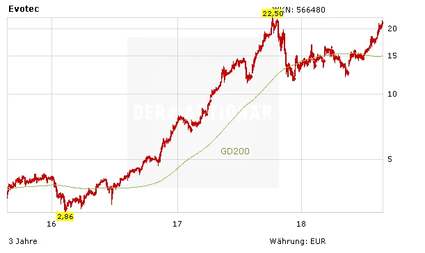 Evotec profitierte zuletzt von einer neuen strategischen Allianz mit Novo Nordisk. Das Mehrjahreshoch vom Oktober vergangenen Jahres bei 22,70 Euro ist nun in direkter Reichweite. Auch hier bleibt DER AKTIONÄR klar positiv gestimmt. Evotec hat vor Kurzem eine ähnliche Korrektur, wie sie derzeit Morphosys durchläuft, erfolgreich abgeschlossen und seitdem ordentlich Fahrt aufgenommen. Anleger lassen ihre Gewinne weiter laufen.