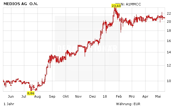 Die Aktie von Medios tendierte in den vergangenen Wochen seitwärts, nachdem das Papier zuvor eine starke Rallye hingelegt hatte. Am heutigen Mittwoch gewinnt die Aktie 0,5 Prozent auf 21 Euro. Die Zeit der „Krafttankphase“ könnte nun bald abgeschlossen sein und es könnte ein Angriff auf das im Januar markierte Allzeithoch bei 23,60 Euro (Xetra) erfolgen. Die fundamentalen Rahmenbedingungen dafür stimmen in jedem Fall. Anleger lassen ihre Gewinne von mittlerweile mehr als 70 Prozent seit der Empfehlung des AKTIONÄR im August vergangenen Jahres weiter laufen.