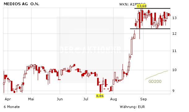 Nach dem starken Anstieg unter anderem infolge der Prognoseanhebung im August konsolidiert die Medios-Aktie derzeit leicht. Gelingt der Sprung über das jüngst bei 13,68 Euro markierte hoch, dürften rasch Anschlusskäufe folgen. Die nächste Zielmarke liegt bei 15 Euro. Mittelfristig rechnet DER AKTIONÄR mit Kursen im Bereich von 18 Euro. Investierte Anleger bleiben engagiert und ziehen den Stopp zur Absicherung leicht auf 9,50 Euro nach.