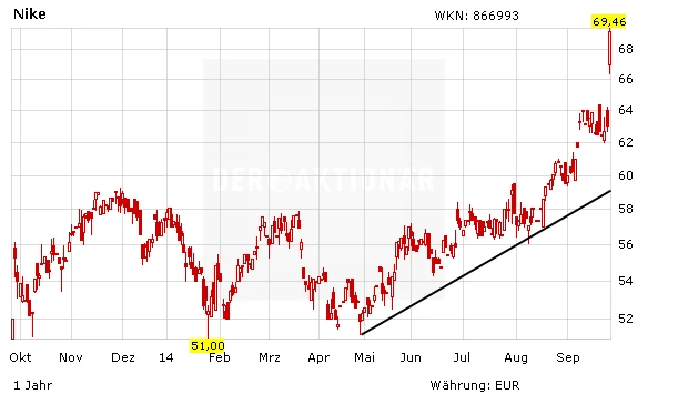 Analyst Michael Binetti von der Schweizer Großbank UBS sprach von einem tadellosen Quartal für Nike. Das nun angepeilte Gewinnwachstum für das gesamte Geschäftsjahr von mehr als 20 Prozent sei womöglich sogar zu konservativ. Der Experte hat seine Kaufempfehlung bestätigt und sein Kursziel von 90 auf 96 Dollar angehoben.