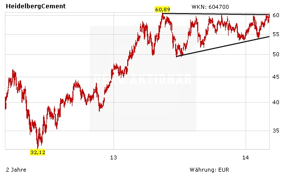 In den zurückliegenden zwölf Monaten hatte HeidelbergCement mehrmals einen Anlauf unternommen, diese Marke zu überspringen. Im Mai 2013 schien einer dieser Versuche auch zu gelingen, doch bei 60,89 Euro drehte der Kurs wieder in Richtung 50 Euro. Alle weiteren Anläufe blieben erfolglos, wobei sich in den letzten Monaten die Trading-Range auf 55 bis 60 Euro zusammengezogen hat.
