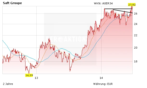 Charttechnisch hat das Papier nun ein weiteres Kaufsignal generiert. Die Saft-Aktie hat die Marke bei 27 Euro übersprungen und notiert über allen wichtigen Durchschnittslinien. Auch fundamental ist noch Luft nach oben: Die Dividendenrendite liegt bei 2,7 Prozent.