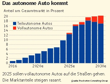 Noch klingt das autonome Auto nach Zukunftsmusik. Doch Experten gehen von rasanten Fortschritten aus. Es wird damit gerechnet, dass bereits 2030 über 20 Prozent aller Autos zumindest teilautonom fahren werden (siehe Grafik unten). 2035 sollen dann bereits zehn Prozent der Fahrzeuge komplett autonom unterwegs sein – Fahrer müssten gar nicht mehr eingreifen und können beispielsweise während der Fahrt arbeiten. Ein Luxus, der sich für die Hersteller der Technologie in jedem Fall auszahlen dürfte.