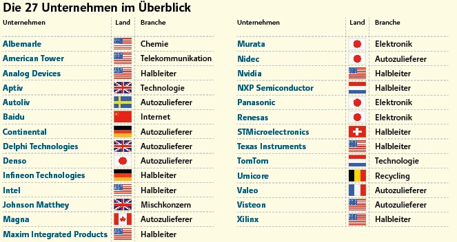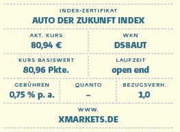 Es ist jedoch kaum vorherzusagen, welche Konzerne vom Durchbruch der neuen Autogeneration letztlich besonders profitieren werden. Wer breit gestreut auf potenzielle Profiteure setzen will, kann deshalb auf das Zertifikat der Deutschen Bank auf den „Auto der Zukunft“-Index zurückgreifen. Der Index beinhaltet 27 internationale Unternehmen, die aktiv an der Entwicklung von Fahrerassistenzsystemen und Fahrzeugelektrifizierung beteiligt sind. Denn es sind diese beiden Bereiche, die für den revolutionären Fortschritt in der Branche sorgen und die Zukunft neu definieren. Anleger treffen dabei auf bekannte deutsche Unternehmen wie Continental oder Infineon, auf internationale Big Player wie Baidu oder Intel, aber auch auf eher unbekannte Namen wie American Tower oder Murata.