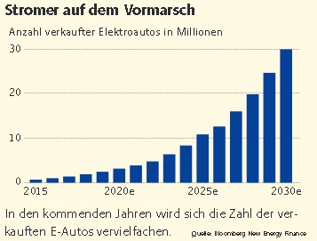 Ähnlich sieht es bei der Elektromobilität aus. Aktuell sind insgesamt über drei Millionen E-Autos weltweit unterwegs, der Marktanteil in Deutschland beispielsweise beträgt lediglich 1,6 Prozent. Doch das dürfte sich ändern – und zwar schnell. Bereits 2030 sollen 30 Millionen Stromer pro Jahr verkauft werden, 2040 wird sogar mit 60 Millionen gerechnet.