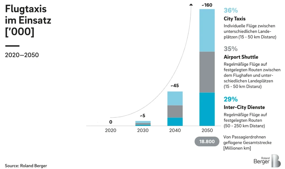 Luftfahrtexperte Manfred Hader von der Unternehmensberatung Roland Berger sagte im November der WELT. „Wahrscheinlich werden nur grob zehn bis 15 Prozent der Vorhaben letztlich erfolgreich sein.“ Doch den Überlebenden winkt ein gigantischer Markt. Die neue Studie prognostiziert für das Jahr 2050 nicht mehr nur von 100.000 sondern bereits 160.000 Passagierdrohnen im Einsatz. Diese würden inklusive Serviceleistungen dann 90 Milliarden Dollar erlösen.