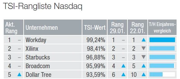 Bereits seit dem 02. Januar befindet sich die Aktie von Workday im Portfolio des TSI-Fonds und ist seit dem über 20 Prozent im Plus. Die Trendstärke konnte sich zuletzt weiter extrem hoch halten. Im TSI-Ranking belegt der Wert bereits seit Wochen den ersten Platz mit einem fast perfekten Wert von 99,24 Prozent. Über die aktuellen Aktien des TSI-Fonds wie auch Workday informiert auch der kostenlosen Newsletter auf www.tsi-fonds.de.