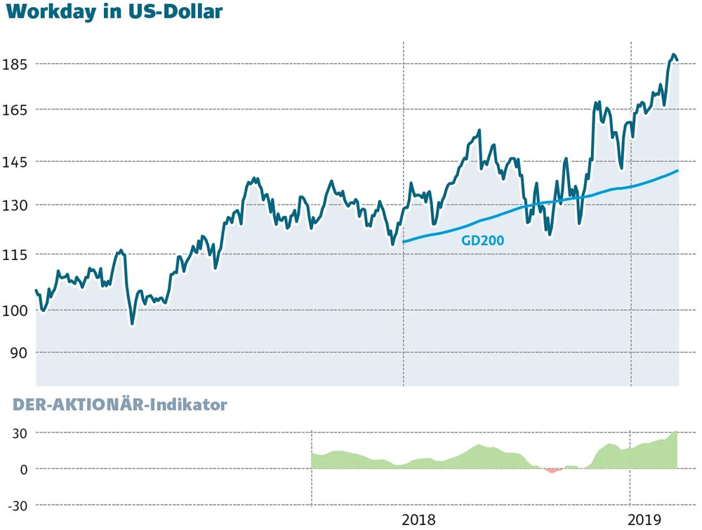 Die Dynamik der Aktie im vergangenen Jahr wurde durch das starke Kunden- und Umsatzwachstum des Unternehmens im Laufe des Jahres getrieben. Das Geschäft wuchs 2018 rasant. Für die ersten neun Monate 2018 stieg der Umsatz von Workday um 30 Prozent gegenüber dem Vorjahr. Die Abonnement-Umsätze, die 84 Prozent des Gesamtumsatzes von Workday ausmachen, stiegen in diesem Zeitraum um 32 Prozent. Nach diesen guten Ergebnissen hat der Konzern den Ausblick für das Gesamtjahr 2019 angehoben. Das Unternehmen erwartet für das Gesamtjahr einen Abonnement-Umsatz zwischen 2,375 Milliarden und 2,377 Milliarden Dollar, was einem Wachstum von rund 33 Prozent gegenüber dem Vorjahr entspricht. Am 28. Februar wird Workday seien Zahlen für das Gesamtjahr vorlegen. Dies könnte erneut Schwung in die Aktie bringen.