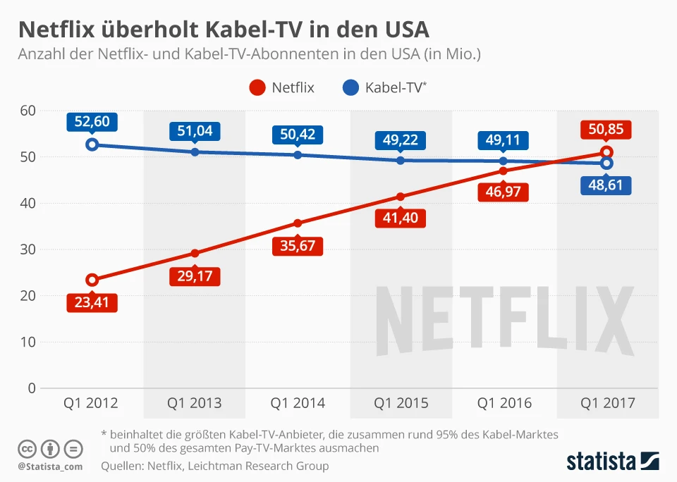 Im selben Zeitraum hat der Streaming-Dienst Netflix in den USA einen Zuwachs von 1,42 Millionen Nutzern auf insgesamt 50,85 Millionen Abonnenten gemeldet. Damit gab es im ersten Quartal erstmals mehr Netflix-Abonnenten als Kabel-TV-Seher. Für Netflix ist es ein weiterer Meilenstein, nachdem erst vor wenigen Wochen die Marke von weltweit 100 Millionen Abonnenten geknackt hatte.