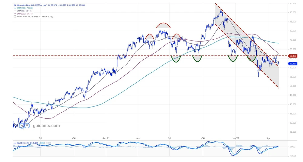 Die Aktien von Mercedes befinden sich aktuell in einer schwierigen Gesamtsituation. Zwar konnte die Rückkehr in den von November 2021 bis April 2022 intakten Abwärtsmodus verhindert werden, das nachhaltige Überschreiten der 66,48 Euro-Hürde schlug allerdings fehl. „Damit bleibt der Abwärtsdruck vorerst erhalten. Auch deswegen, weil aktuell die 38-Tage-Linie bei 63,45 Euro unterhandelt wurde. Der Test des 61,8-Fibonacci-Retracements (62,51 Euro) ist möglich, auch wenn es am Donnerstag wieder deutlich nach oben geht. Zudem ist die Markttechnik alles andere als erfreulich. Der Trendfolge-Indikator MACD signalisiert ein Verkaufssignal. Die Wolke („Kumo“) des Ichimoku-Kinko-Hyo wurde am 02.05.2022 mittels eines Erschöpfungs-Gaps nach unten verlassen. Seitdem zeugen drei Dojis in Folge von deutlicher Unsicherheit und Nervosität“, sagt Charttechnik-Experte Martin Utschneider von Donner & Reuschel.