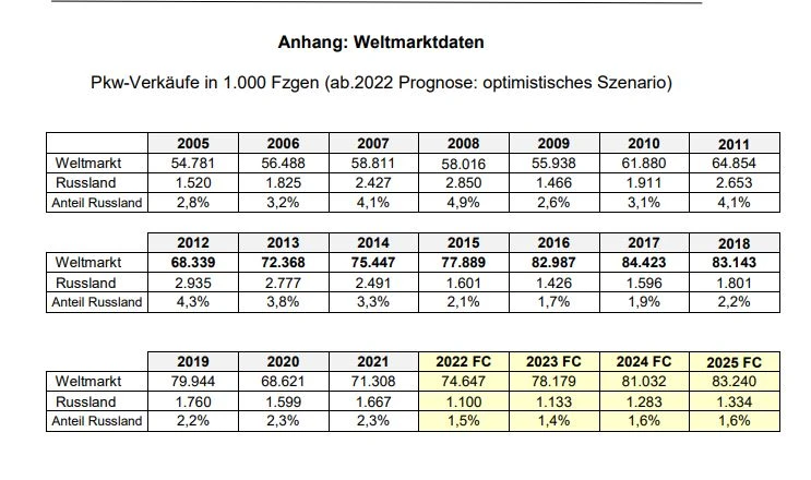 Deshalb stehen auch die Aktien der deutschen Autobauer Volkswagen, BMW und Mercedes-Benz zuletzt verstärkt unter Druck. Es geht weniger um den russischen Automarkt. Denn dieser ist mit geschätzten 1,7 Millionen Neuwagen jedes Jahr im Vergleich zum Gesamtmarkt - 71 Millionen neu verkaufte Autos jedes Jahr weltweit – unbedeutend für die deutschen Hersteller (siehe Grafik).
