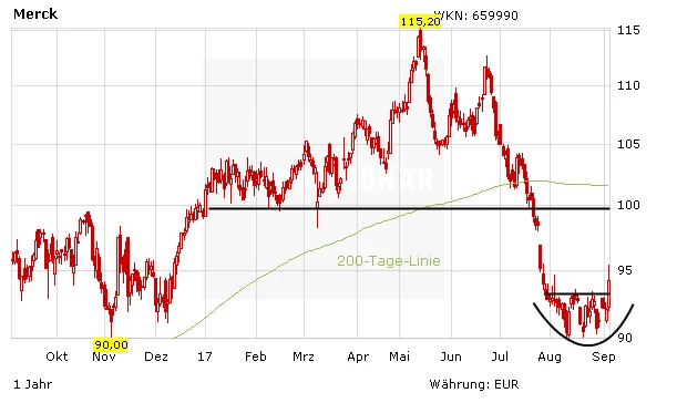 Aktionäre der Merck KGaA hatten in den vergangenen Handelswochen wenig Grund zur Freude. Im schwachen Marktumfeld verlor das Papier seit Juni rund 20 Prozent an Wert. Mittlerweile haben die DAX-Titel einen Boden um die 90-Euro-Marke ausgebildet – und ein frisches Kaufsignal generiert. Der Auslöser: Merck prüft alle Optionen für das Consumer-Health-Geschäft.
