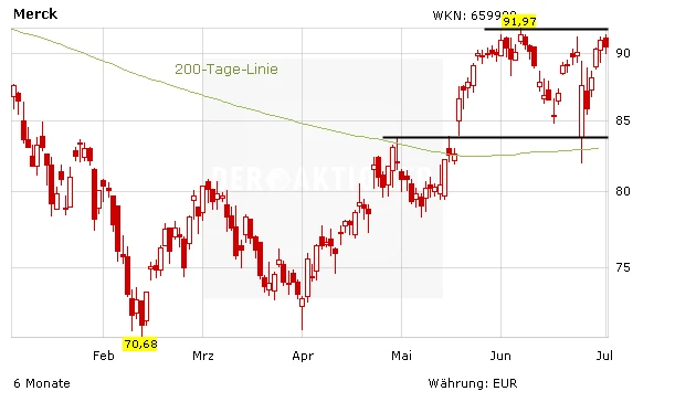 Die Aktie von Merck hat sich von ihrer Korrektur im Zuge der allgemeinen Marktschwäche Mitte Juni zuletzt wieder merklich erholen können. Zuvor wurde die 200-Tage-Linie erfolgreich verteidigt. Wichtig ist nun allerdings aus charttechnischer Sicht, dass das Jahreshoch bei 91,97 Euro nach oben überwunden werden kann. Dann wäre der Weg frei bis in den Bereich der insbesondere psychologisch wichtigen Hürde bei 100 Euro. Und auch das bisherige Allzeithoch aus dem Jahre 2015 wäre dann nicht mehr weit entfernt.