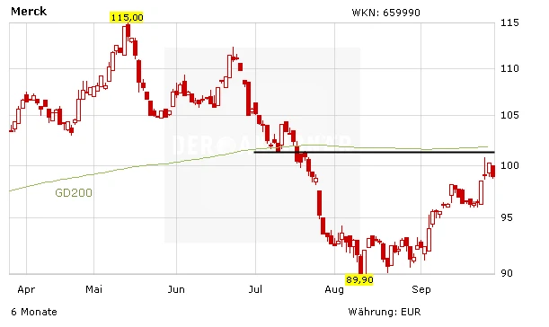 Die Aktie von Merck hat zuletzt eine große Aufholjagd gestartet, nachdem das Papier seit Ende Juni förmlich nach unten durchgereicht wurde. Dabei gelang es der Aktie sogar, die 100-Euro-Marke kurzzeitig zurückzuerobern. Ein wirklicher Ausbruch darüber sowie über die knapp darüber verlaufende 200-Tage-Linie ist allerdings bislang nicht gelungen. Erst ein Sprung darüber würde ein positives charttechnisches Signal liefern.