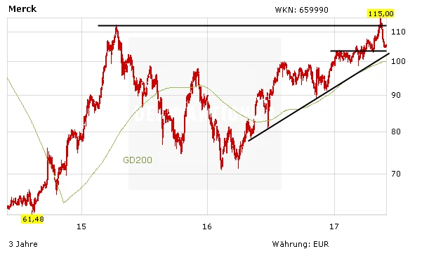 Die Aktie von Merck war vor Kurzem deutlich angestiegen, nachdem bekannt wurde, dass das Unternehmen seine Biosimilar-Sparte an Fresenius verkaufen wird. Dabei gelang sogar der Sprung auf ein neues Allzeithoch. Zuletzt ist der der Wert jedoch in den Konsolidierungsmodus verfallen und auch unter das alte Hoch zurückgefallen. Für noch nicht investierte Anleger ergibt sich dadurch noch einmal eine interessante Einstiegschance. Investoren, die mit Hebelwirkung auf einen baldigen erneuten Anlauf auf die Rekordstände setzen möchte, wählt den WAVE-Call der Deutschen Dank mit der WKN DM149D, der sich auch im Hebel-Depot des AKTIONÄR befindet.