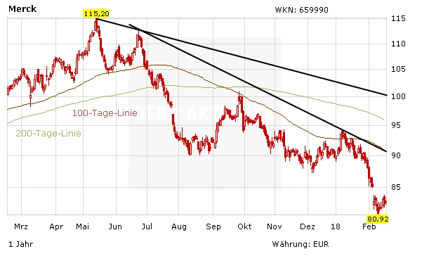Vor Kurzem hat die Merck-Aktie bei 80,92 Euro ein neues 52-Wochen-Tief markiert. Der seit Mai bestehende Abwärtstrend ist unverändert intakt. Die Negativ-Meldung drückt weiter auf die Stimmung. Ein Einstieg drängt sich bei der DAX-Aktie vorerst nicht auf, auch wenn nun vieles im Aktienkurs eingepreist ist.
