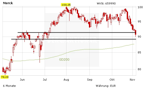 Die Aktie von Merck hat zuletzt den Rückwärtsgang angetreten, nachdem das Papier erneut an der wichtigen Marke von 100 Euro gescheitert war. Am Freitag verliert die Aktie 1,9 Prozent auf 90,60 Euro. Die gesamte Pharmabranche belastet derzeit die in der kommenden Woche anstehende US-Präsidentschaftswahl. Aus charttechnischer Sicht ist es nun wichtig, dass die Merck-Aktie die Unterstützung im Bereich von 87 Euro verteidigen kann. Neueinsteiger können versuchen, mit einem engen Stopp in diesem Bereich zum Zuge zu kommen.