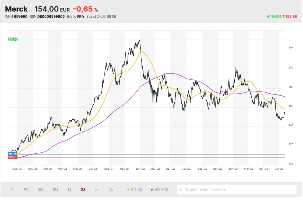 Auffällig bei Merck – in den letzten fünf Quartalen wurden die Schätzungen zumeist verfehlt. Die Branche kämpft mit Umsatzrückgängen, das dürften die Konzernzahlen der Darmstädter ebenfalls bestätigen. Daraufhin könnte der Kurs der Aktie signifikant nachgeben und somit den gesamten Sektor erneut belasten. Das Chartbild bei Merck sieht nicht positiv aus, seit Anfang des Jahres befindet sich der Anteilsschein in einem klaren Abwärtstrend. Anleger sollten vor einem Investment die Konzernergebnisse Anfang August abwarten.