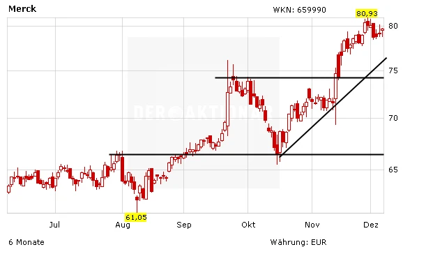 Aus charttechnischer Sicht notiert die Merck-Aktie auf dem Niveau des Allzeithochs bei 80,65 Euro. Der Wert hat auf Jahressicht bereits rund 25 Prozent zugelegt. Damit zählt der Titel zu den Top-Performern im DAX. Eine Unterstützung findet sich im Bereich von 74 Euro.