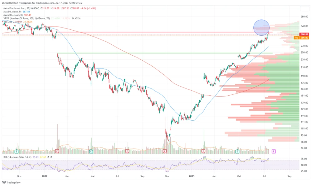 Jedoch gibt es ein Manko: der RSI-Oszillator deutet mit einem Wert von über 70 Prozent an, dass die Scheine überhitzt sind. Auch wenn damit die Korrekturgefahr erhöht ist, stehen die Chance im Moment noch immer gut, dass die Rally weitergeht. Denn die Aktie steht aktuell inmitten eines Gaps, das sie Anfang 2022 zwischen 248,00 und 316,87 Dollar aufgerissen hatte. Aufgrund der insgesamt bullishen Tendenz ist so kurzfristig mit einem Gap-Close zu rechnen. Darüber wartet als nächstes Ziel das Volume-Peak bei 335 Dollar. Nach einer möglichen Verschnaufpause in diesem Bereich wäre der Weg bis an das Rekordhoch bei 384,33 Dollar frei.