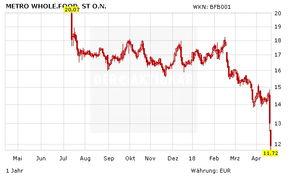 Zeitweilig notiert der Kurs der Stammaktien nur noch bei 11,79 Euro - der tiefste Stand seit Juli 2017, als Metro in den Groß- und Einzelhandel (jetzt Metro AG) und den Elektrohandel (jetzt Ceconomy AG) aufgespalten wurde. Damals war Metro mit einem Kurs von 20 Euro an der Börse gestartet. Allein seit den Tageshöchstständen am vergangenen Freitag hat die Metro-Aktie nun mehr als 20 Prozent verloren.