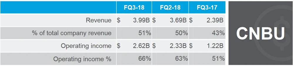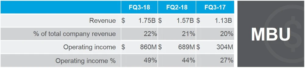 Insgesamt steigerten sich die Umsätze um 40 Prozent auf 7,8 Milliarden Dollar. Die Bruttomarge erreichte satte 61 Prozent. Die vorherrschenden Trends Cloud-Data-Center und Smartphones treiben Umsätze und Gewinne an. Dies wird besonders deutlich, wenn die einzelnen Segmente beleuchtet werden.
