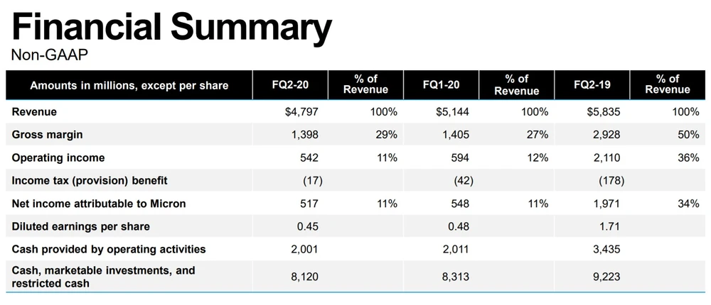 Auch beim Gewinn pro Aktie von 0,45 Dollar lag Micron 0,08 Dollar über den Erwartungen. Insgesamt lag der Konzerngewinn bei 517 Millionen Euro. Dennoch liegen die Umsätze, auch wegen des Coronavirus, sieben Prozent unter die des vorherigen Quartals und 18 Prozent unter die Ergebnisse des Vorjahreszeitraums.