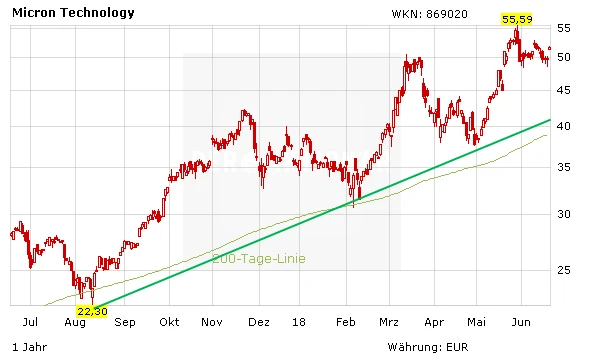 Die Analysten von JPMorgan gehen jedenfalls davon aus und empfehlen Anlegern auch vor den Zahlen bei Micron long zu bleiben. Analyst Harlan Sur schrieb: „Wir sehen weiteres Kurspotenzial für die Aktien von Micron, da die Unternehmensführung in einem Umfeld steigender Speicher-Nachfrage hervorragend wirtschaftet.“ JPMorgan behält das Kursziel von 82 Dollar bei – was aktuell einem Kurspotenzial von 37 Prozent entspricht.
