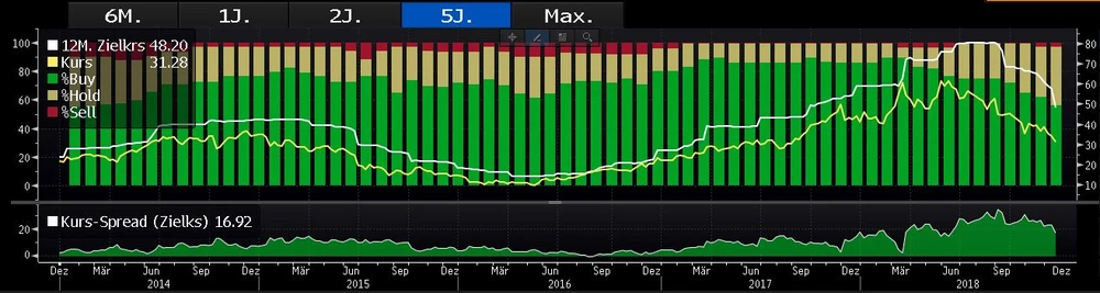 Wie die untenstehende Grafik zeigt, werden die Analysten hinsichtlich der Micron-Aktie zunehmend pessimistisch. Der im Schnitt erwartete Zielkurs nimmt ab. Der Gewinn je Aktie soll im kommenden Jahr von zwölf auf acht fallen. Das erwartete Umsatzwachstum erhält einen Dämpfer: Die Analysten erwarten für 2019 um 14 Prozent schrumpfende Erlöse.