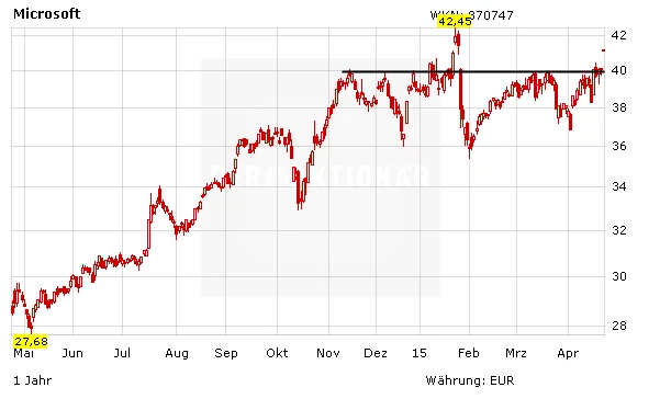 In den vergangenen Monaten hat die Microsoft-Aktie kein gutes Bild abgeliefert. Der Gewinnrückgang durch die Umbaumaßnahmen drückte auf die Stimmung. Inzwischen sind die gesunkenen kurzfristigen Erwartungen aber eingepreist. Geht die neue Strategie der Konzernführung auf, könnte es mit Microsoft bald wieder aufwärts gehen. Charttechnisch ist zuletzt bereits der Ausbruch über den Widerstand bei 40 Euro gelungen. Investierte Anleger bleiben dabei und beachten den Stopp bei 33 Euro. Neueinsteiger warten hingegen noch ab, ob die Erholung nachhaltig ist.