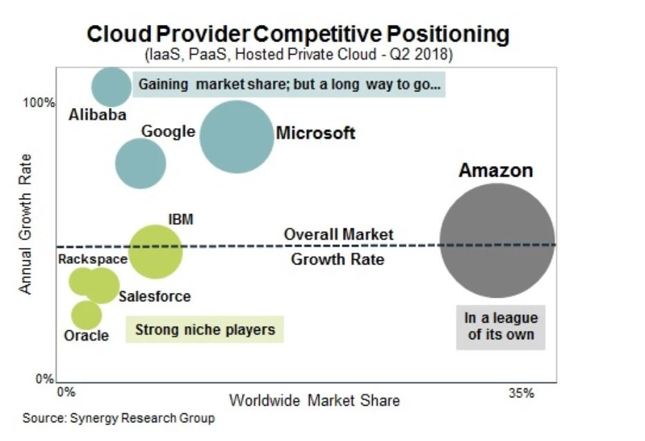 Der Hauptgrund für das starke Abschneiden von Microsoft dürfte die Hybrid-Cloud-Lösung des Konzerns sein. Bereits 2015 setzte der Tech-Riese auf eine Mischung von On-Premise- und Cloud-Servern. Die Hybrid-Cloud wird als eine der aussichtsreichsten Segmente der Cloud-Infrastruktur angesehen.