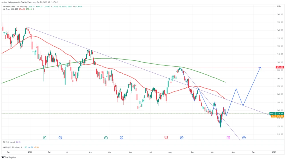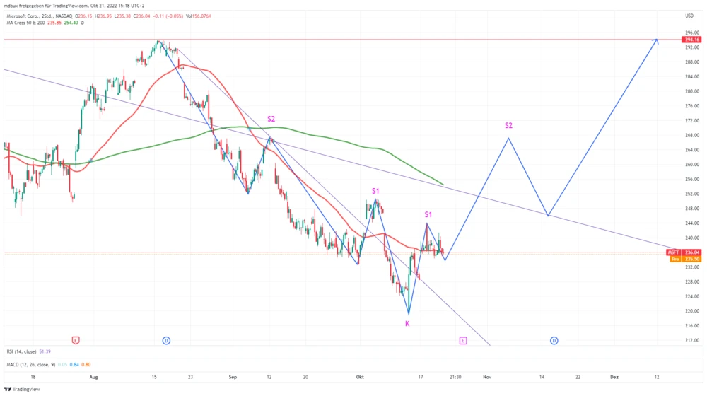Die Microsoft-Aktie hatte zwischen ihrem Zwischenhoch im August bei 294,16 Dollar und dem Tief am 13. Oktober bei 219,17 Dollar einen Verlust von rund 25 Prozent hinnehmen müssen. Es folgte eine dynamische Gegenbewegung und ein Bruch der kurzfristigen Abwärtstrendlinie.